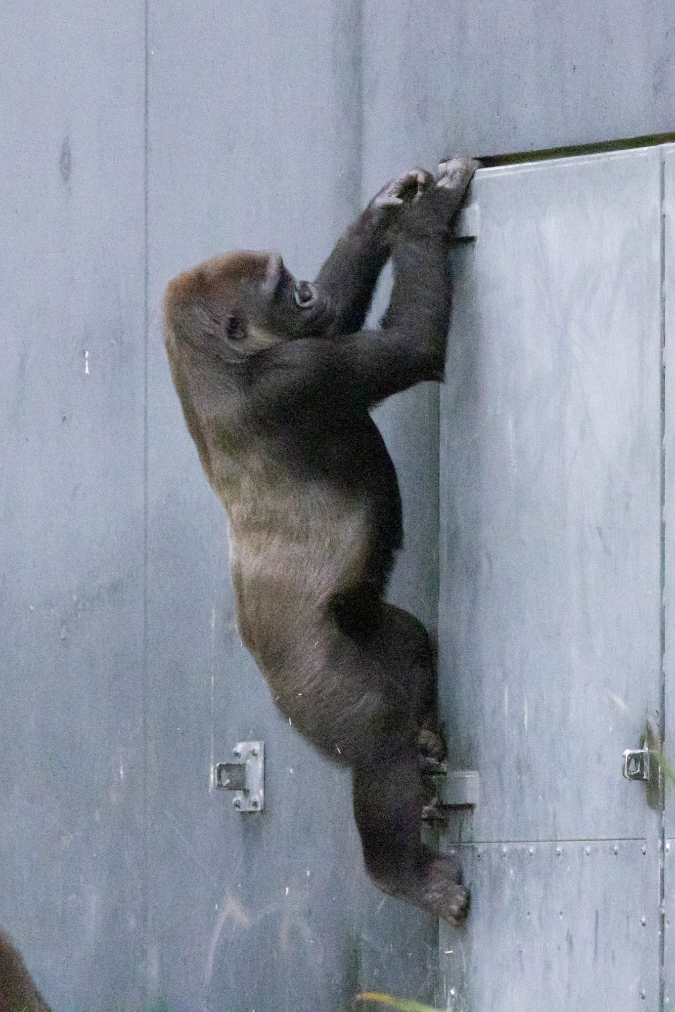 Juvenile gorilla: The gorillas seemd to have turned the shed in their enclosure into a playground climber.